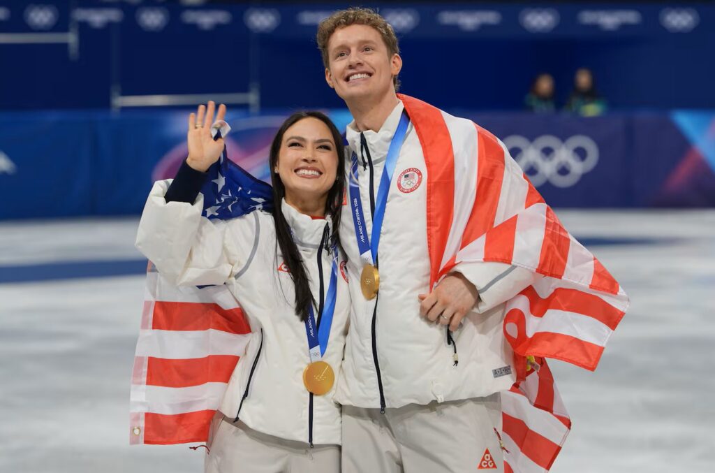 That context mattered, because Chock and Bates weren’t arriving as a curiosity or a developing story — they arrived as the benchmark. Reigning U.S. champions and three-time defending world champions, they carried the kind of résumé that subtly alters how an audience watches even the warm-up. Add in the fact that they had already anchored another team event gold earlier in the Games, and it was easy to sense why their rhythm dance carried extra gravity. The Olympics have a way of tightening even the most gifted skaters. Their task wasn’t to reinvent themselves under pressure, but to look unmistakably familiar — as if this massive stage was simply an extension of the craft they’ve honed together for years.